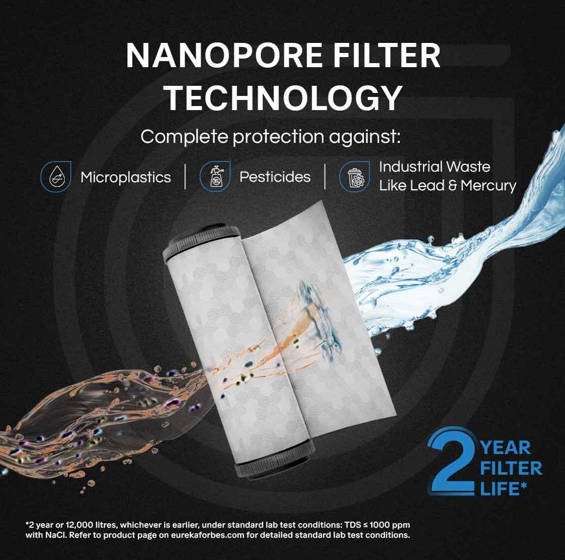 NanoPore Filter Technology: Ensure complete protection against pesticides, microplastics, industrial waste like lead and mercury, bacteria, viruses, and cysts.
