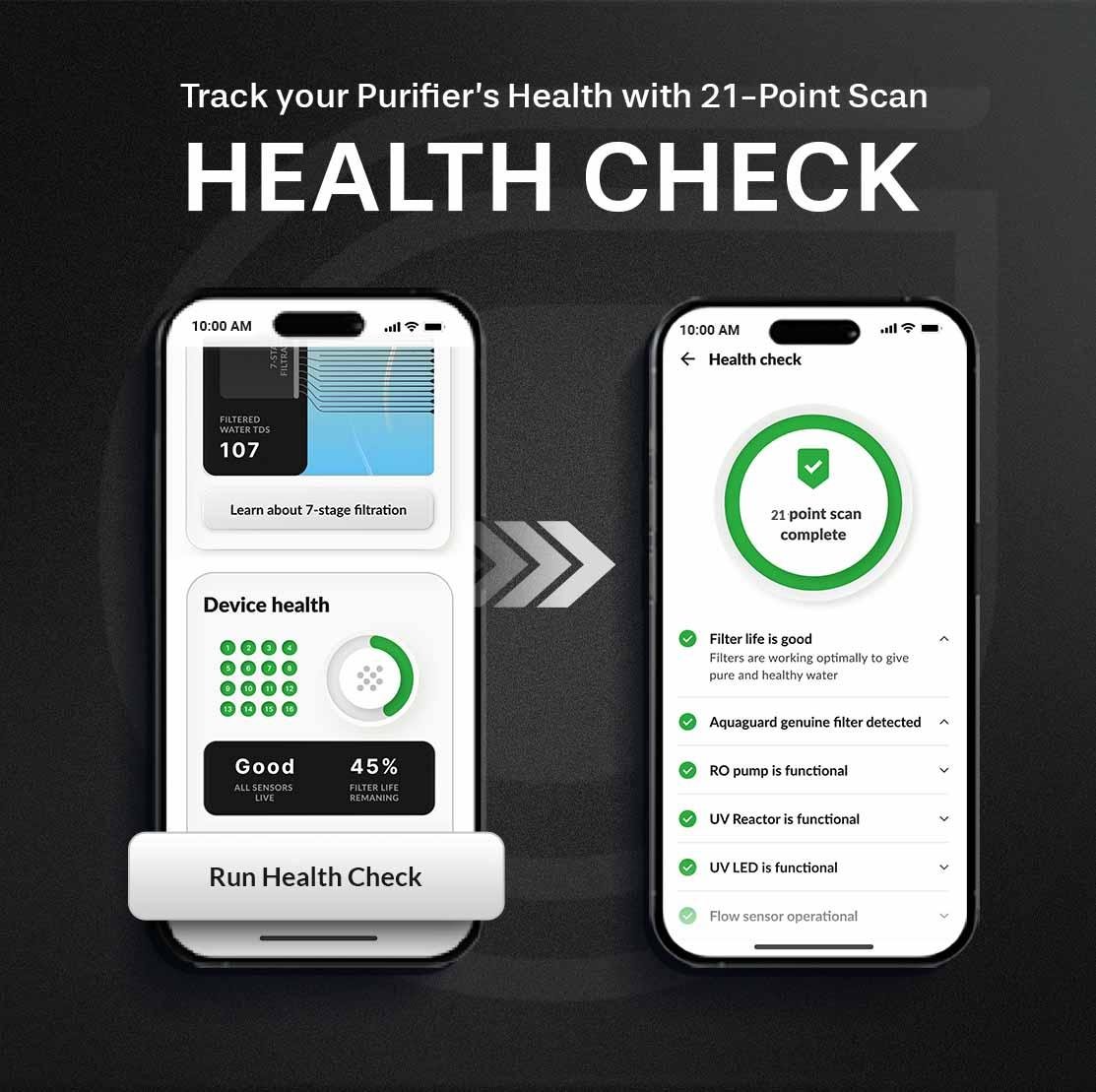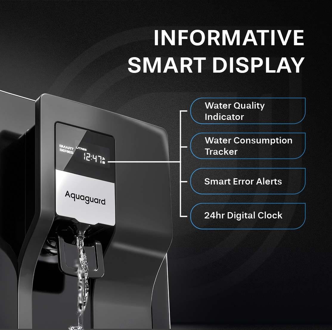 India's First Smart Water Purifier: Equipped with features like Device Health Check that helps user monitor the purifier’s health with a 21-point scan at the touch of a button on the app, Water Quality Indicator provides real-time updates on the input and output TDS, Hydration Monitor helps track your daily, weekly, and monthly water consumption, and Filter Life Monitoring system alerts you when it's time to replace the filters.