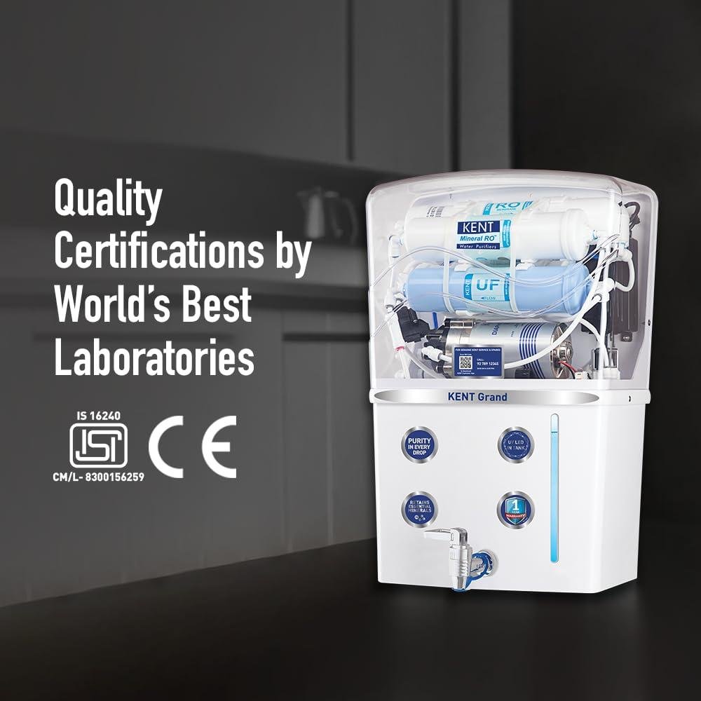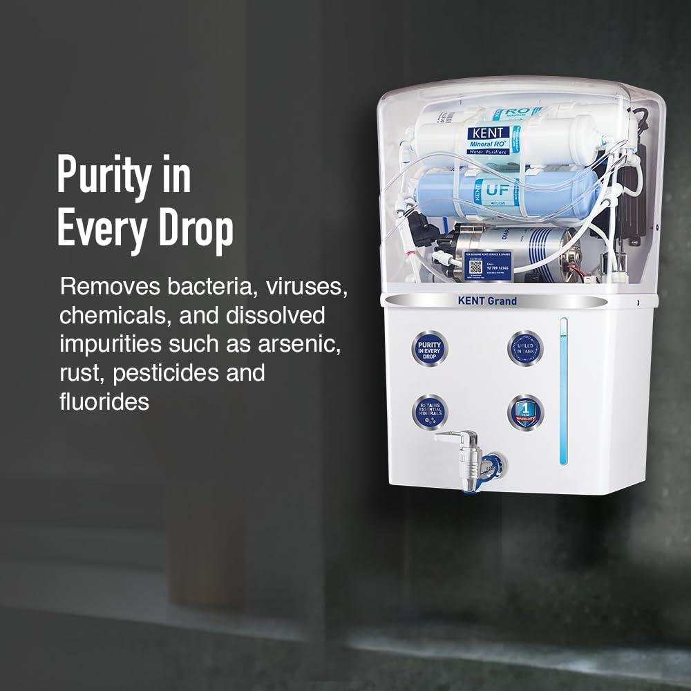 KENT Grand RO Water Purifier | Advanced RO Tech for Sabse Shudh Paani | RO+UF+TDS Control + UV LED Tank | 8L | 20LPH Flow | Ideal for Borewell/Tanker/Municipal Water | Largest Service Network