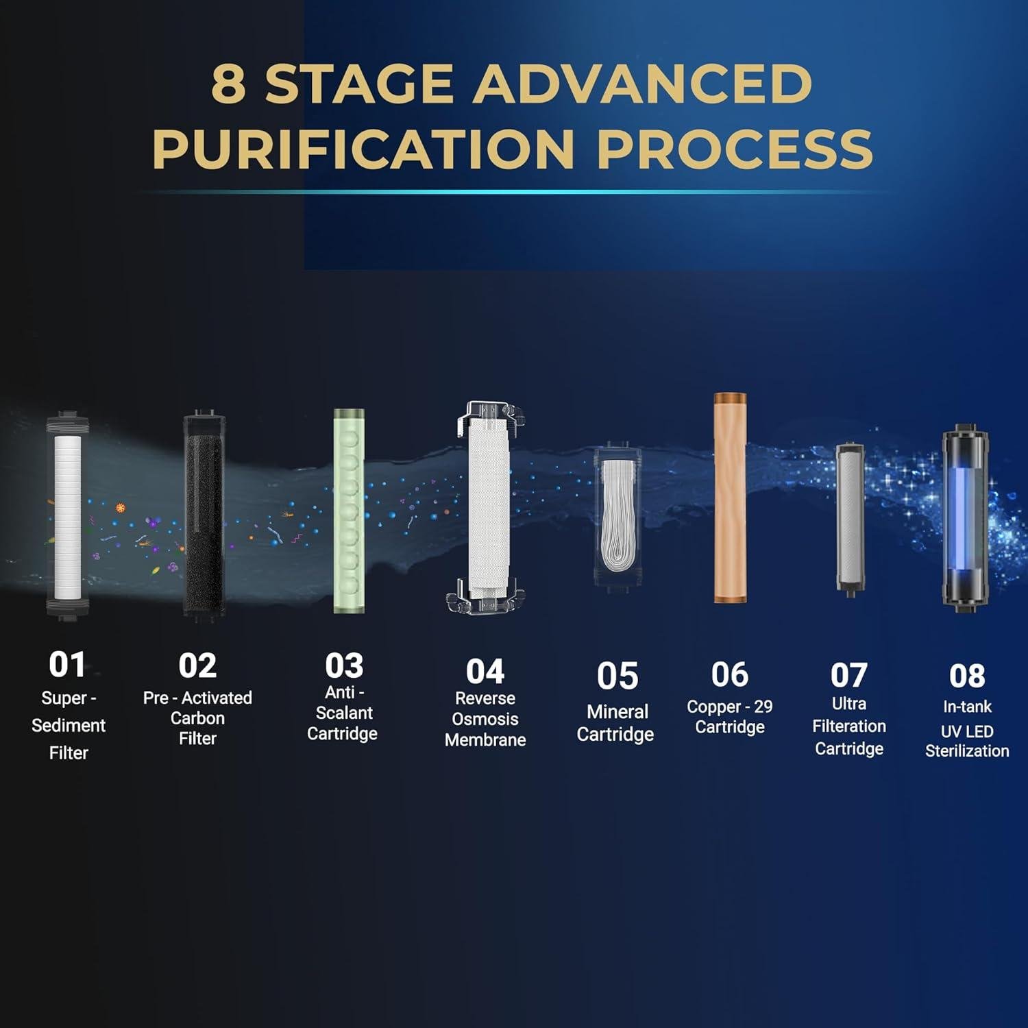 8 Stage Purification and Water Saving Technology: Super Sediment Filter, Carbon Block, Anti-scalant, RO, UF, Mineraliser, Copper, In tank UV Sterilization at every hour. Smart TDS Adjuster enhances taste and provides tasty and healthy water for input water TDS upto 1500 ppm.
