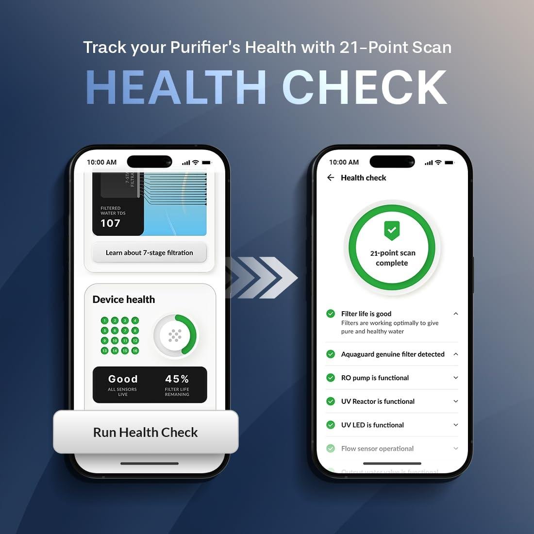 Health Check: Check the health of the device at the touch of a button on the app. This feature lets the user know their purifier's condition in real-time. 21-point scan covers health of filters, RO Pump, UV Lamp, Flow Sensor, etc.