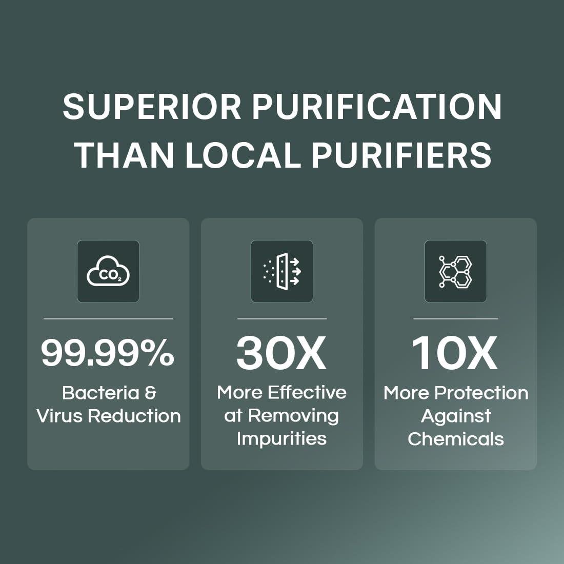 Superior Purification- Offers 99.9999% bacteria reduction, 99.99% virus reduction, 30x better dust and dirt removal than local purifiers, and 10x more chemical protection through Sedi Shield, Particulate Filter and RO Maxx purification stages